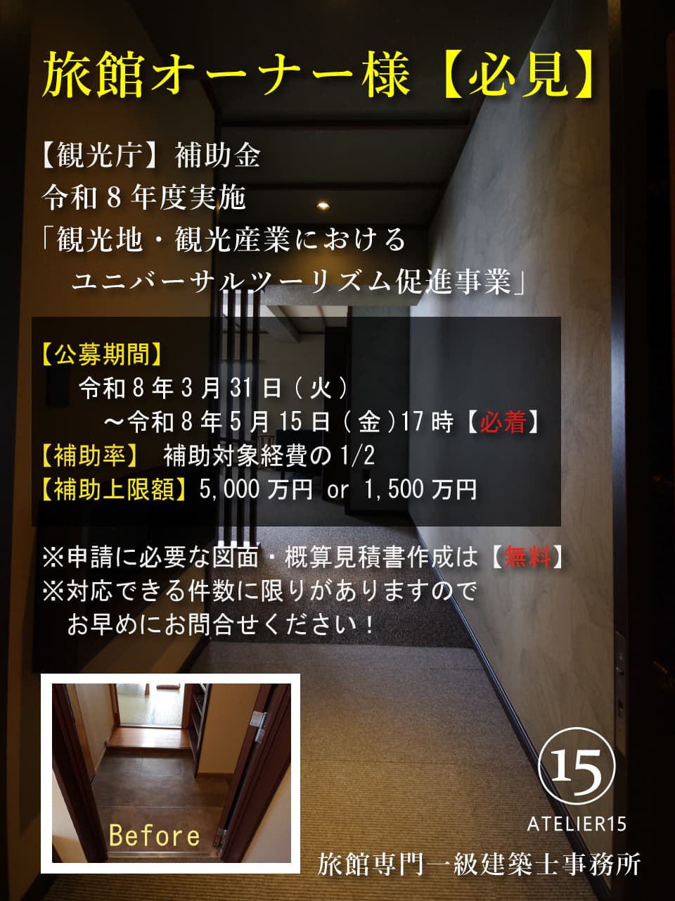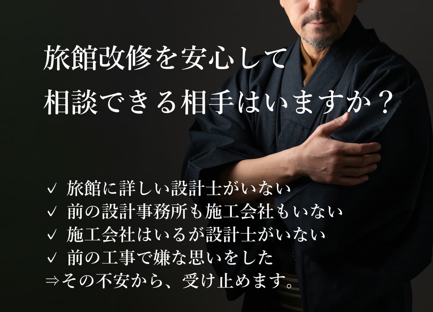 そんな旅館リノベーションに対するオーナー様の『お困り』『悩み』『不安』を“旅館リノベーション”の知識と経験が豊富な一級建築士が《解消・解決》します!